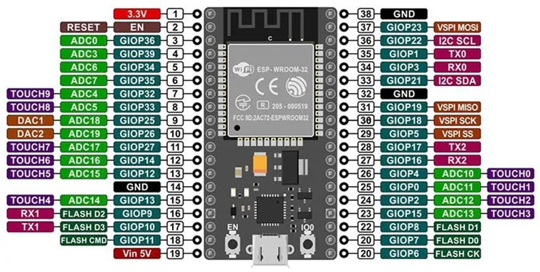 아래는 ESP32 DevKit의 핀맵입니다. TX2/RX2의 위치를 확인하고 정확히 연결해 주세요: